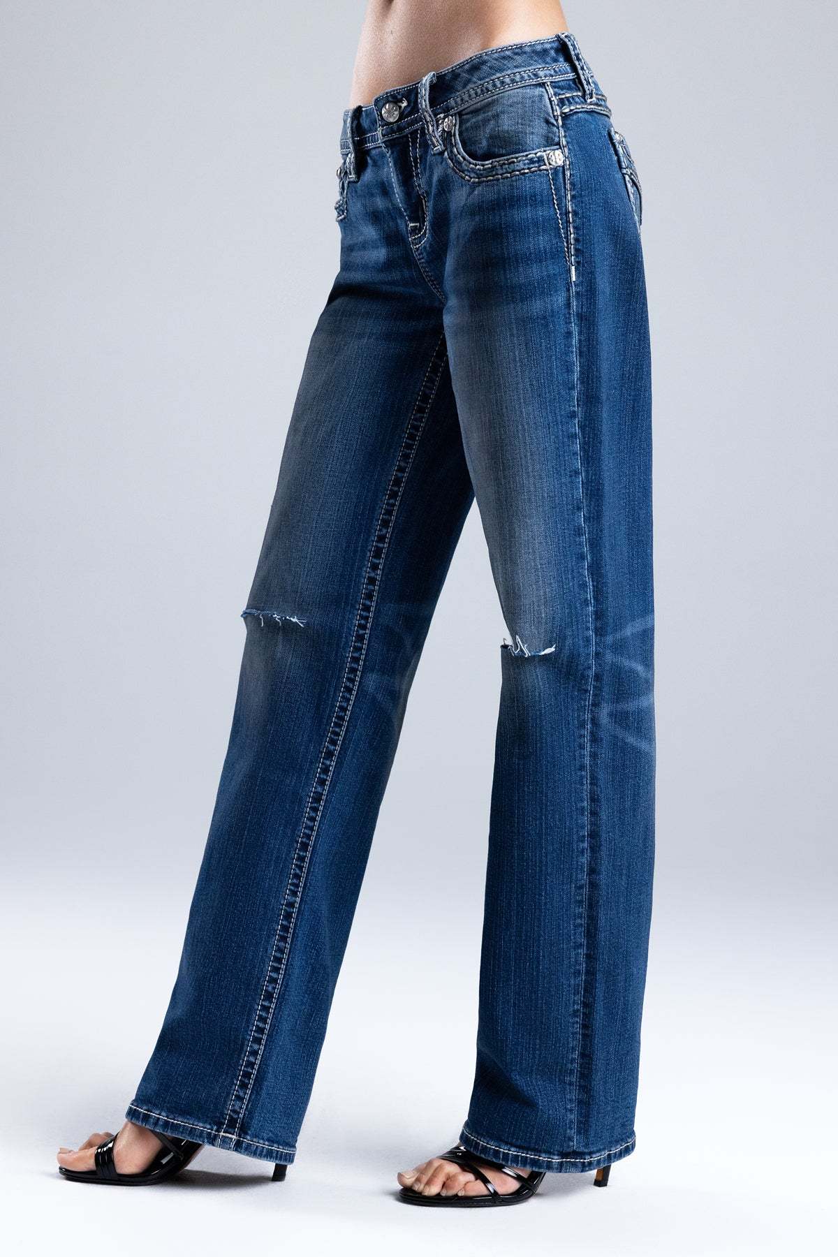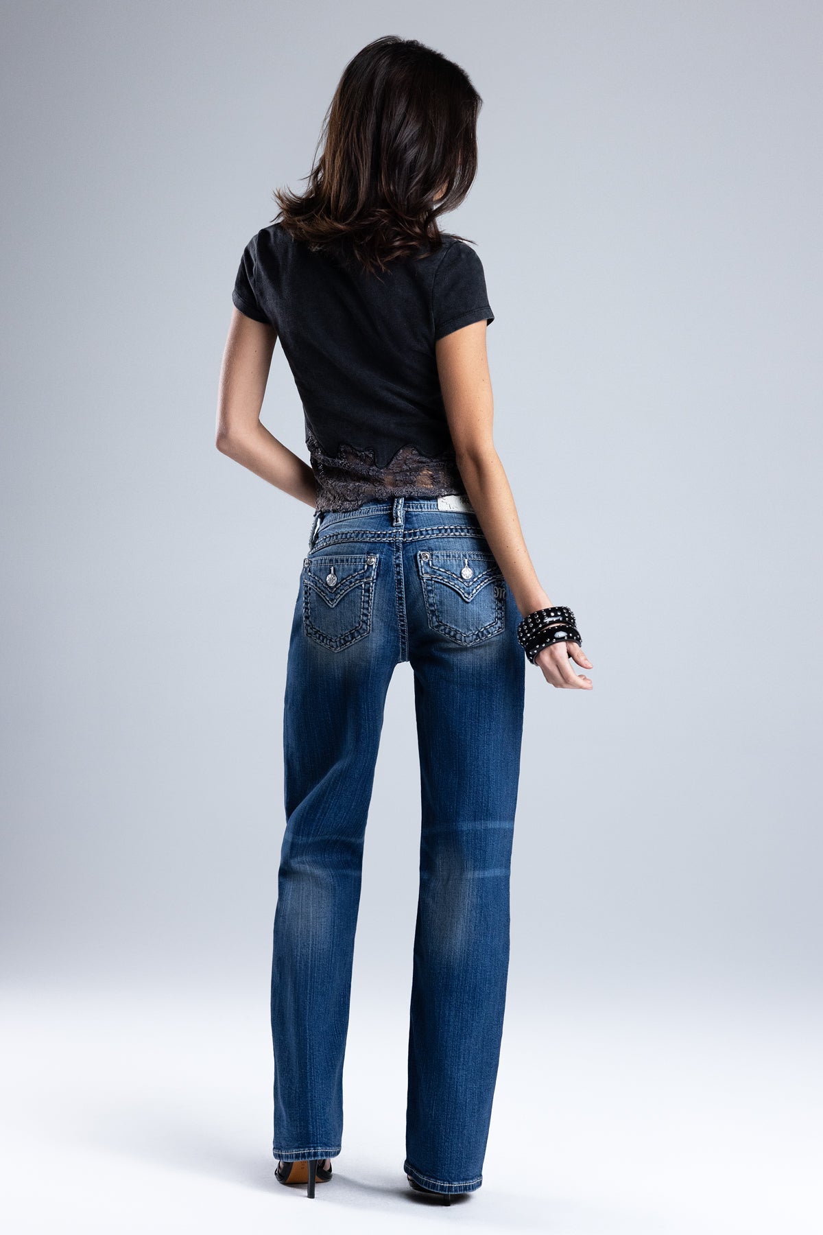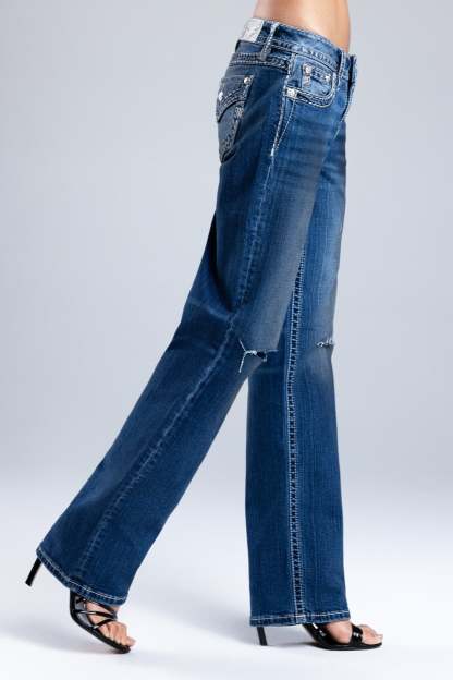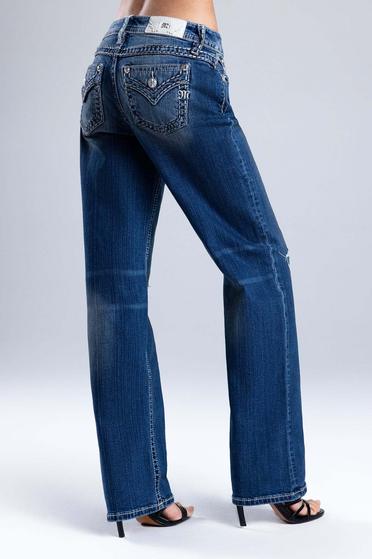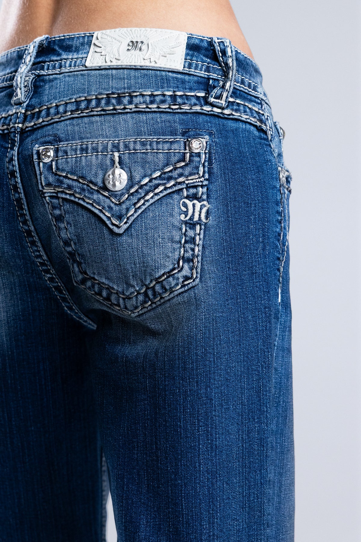 - Embossed white leather wing Miss Me brand patch